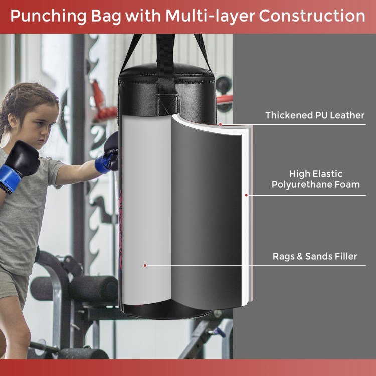 -Brand new and high quality-Including one punch bag, one pair gloves, one rope skipping, one rucksack, and one hook-Perfect for children workout and get into shape-Skipping Rope is good for warm up before boxing.-Training gloves protect your hands while you practice-Fit for Junior Children over 5 years old