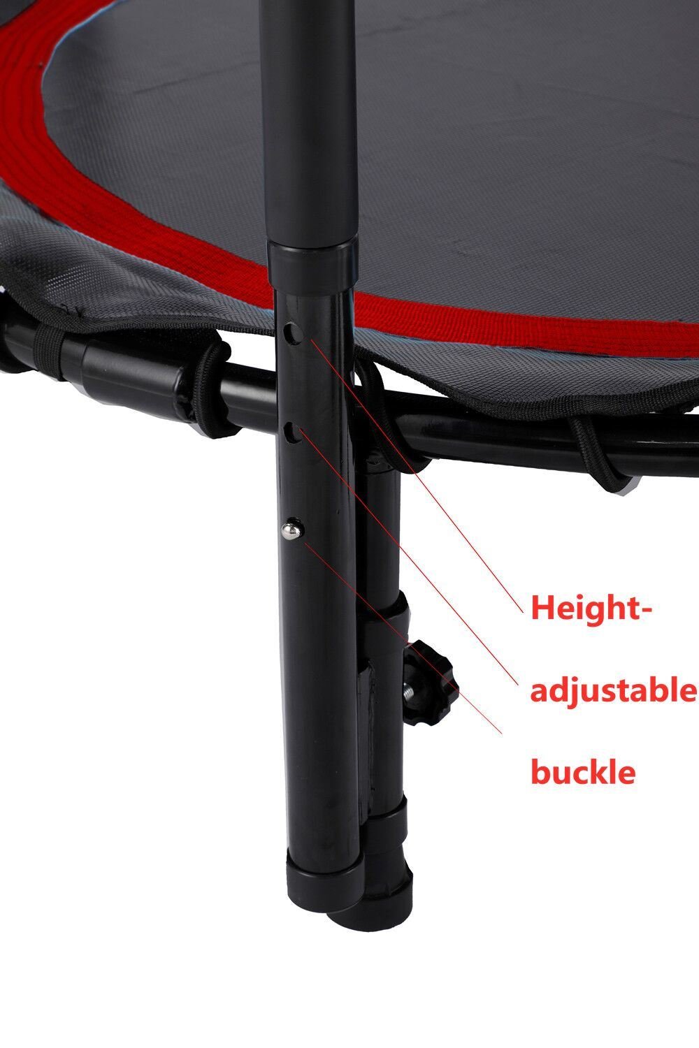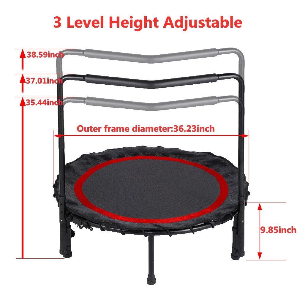 1.Fitness Trampoline with Adjustable Handle: 3 height adjustment handles. They are 35.4-37-38.6inch. Can be adjusted for all ages and height requirements. Handrail improves balance, flexibility and coordination.
