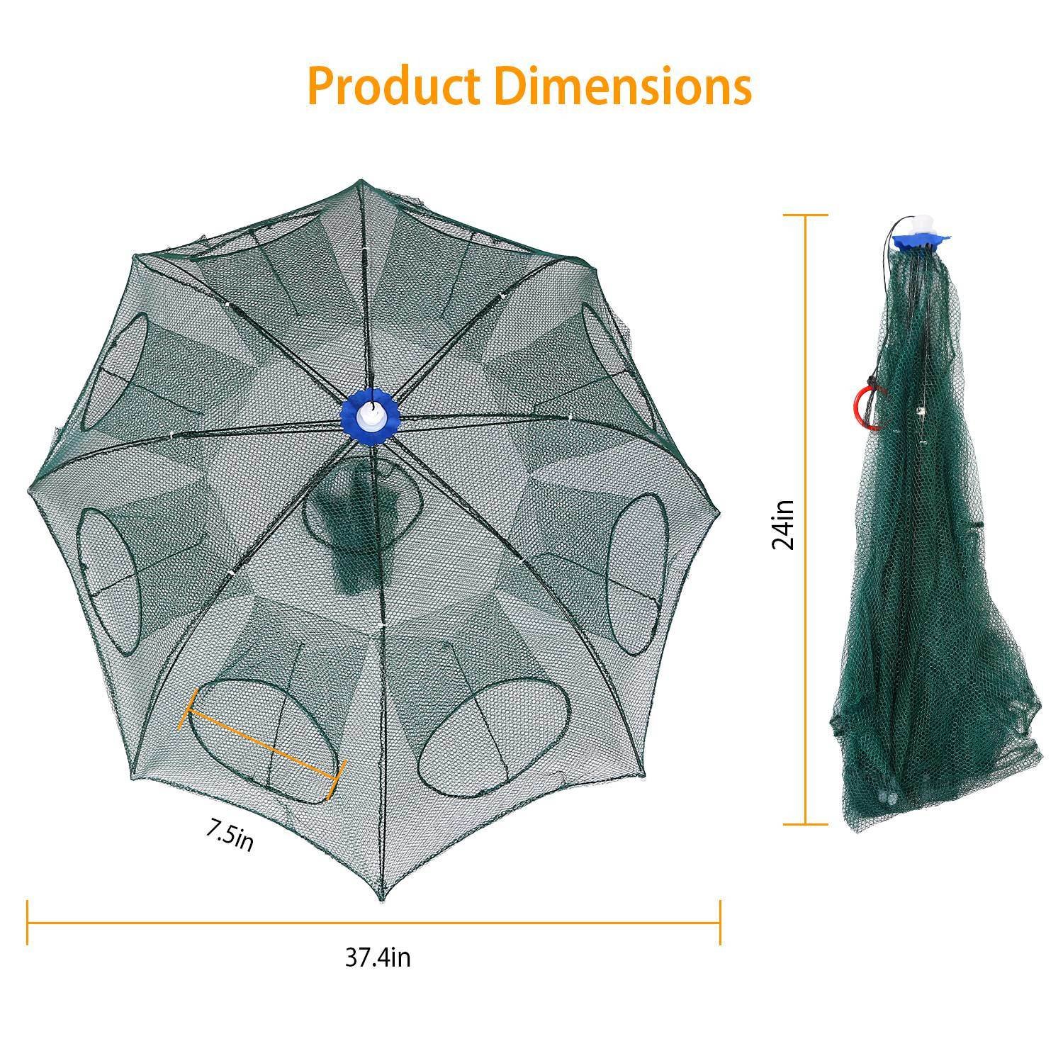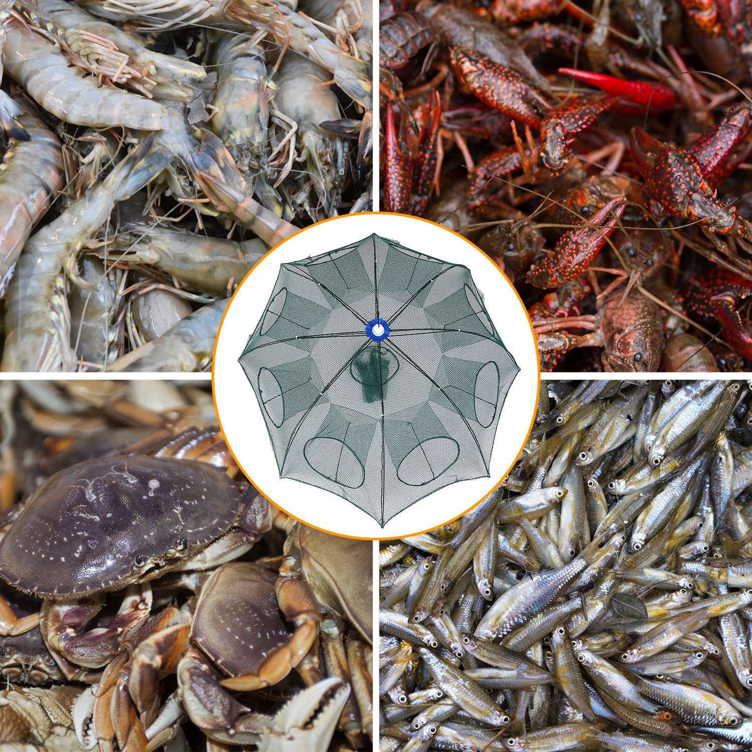 *360 Degree Catch*:8 Entrances sit at different directions; which can help catch smelt; eels; crab; lobster; minnows; shrimp and craw fish more efficiently. As for fish removal; just release the bait pouch and pour out fish.