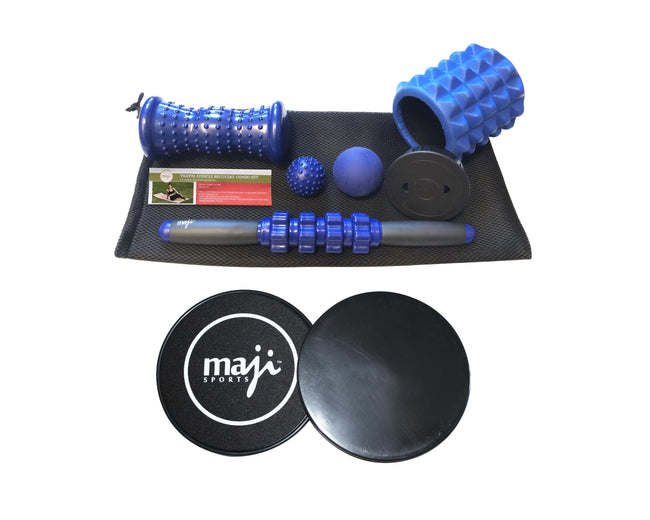 MUSCLE RECOVERY BUNDLE:Silicone Trigger Point BallSize: 6.3 cm- Helps to relieve knots in your muscles that are also known as trigger points, which lead to Myofascial Pain Syndrome.- Relieve tight muscles in the lower back, neck & glutes- Great tool to help release and achieve melting of minor aches and pains to muscular tissue.- Material Composition : SiliconeDeep Tissue Roller StickSize : 14.5'- Increases blood flow to hurting and sore muscles in calves, quads, hams & thighs- Reduces lactic acid & improves sports performance- Reduces muscle knots & trigger points- Accelerates muscle recovery- Improves strength & flexibility to muscles and joints- Middle: 100% PP, Handle: 70% PP, 30% NBRFoot massagerSize: 5 cm- Relieves stiffened muscles and tissues in hands, arms, legs & feet- Stimulates & soothes any sore or tired muscles when you roll it under your feet- A great choice for relieving plantar fasciitis- Small size makes it easy to carry and also use it anytime & anywhere- Material Composition 100% TPRFoot massagerSize: 7.5 x 17.5 cm- The massage roller can be used on your feet, calves, hams, glutes, hands & forms- The massage roller can be used for plantar fasciitis as well as for relieving heel & foot arch pain- The unique pressure points and arc design of the massage roller can greatly relieve muscle pain- High quality PVC material- An ideal product which can be taken to work and on trips in a briefcase or carry-on bag- Material Composition : 100% PVC of High QualityMini Travel Foam RollerSize : 5.1' x 4.7"- Eco-certified EVA foam, SGS passed - 100% raw material, EVA foam- Unique design with dimpled surface for deeper massage to relieve muscular pain and tightness similar to the thumbs of a massage therapist- Stretches muscles and other soft tissues in multiple directions, breaking down "knots" to help increase your flexibility and help relieve back pain- Compact enough to travel withOutside : 100% EVA, Inner : 100 % EVA- Maji Sports Sliding Core Exercise Discs can broaden your range of exercises while reducing your risk of injury.- Perfect for core toning exercises.- The smooth, shiny side works on carpet and the soft side works on hardwood or tile floors.- Maji Sports Sliding Core Exercise Discs engage your core muscles while introducing a balancechallenge.- The long movements are also a good way to increase flexibility.