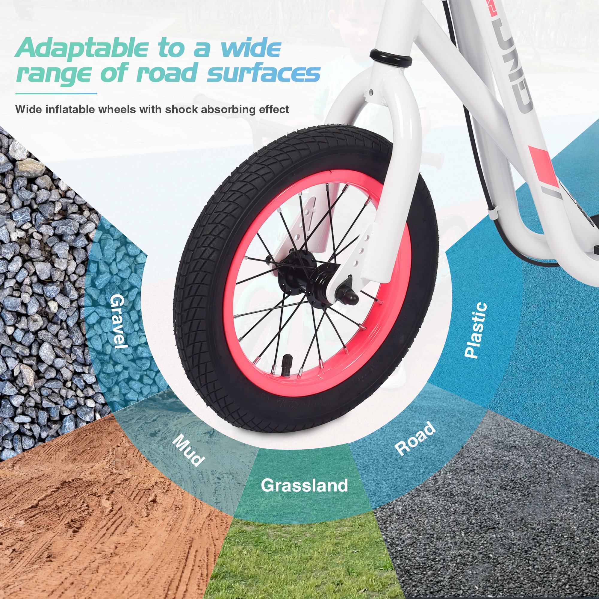 The 2 inflatable 12" wheelshave shock absorption effect,offers smoother and steadier sliding experience. Specially designed surface premium rubber enhances wear resistance and durability, Adaptable to a widerange of road surfaces.